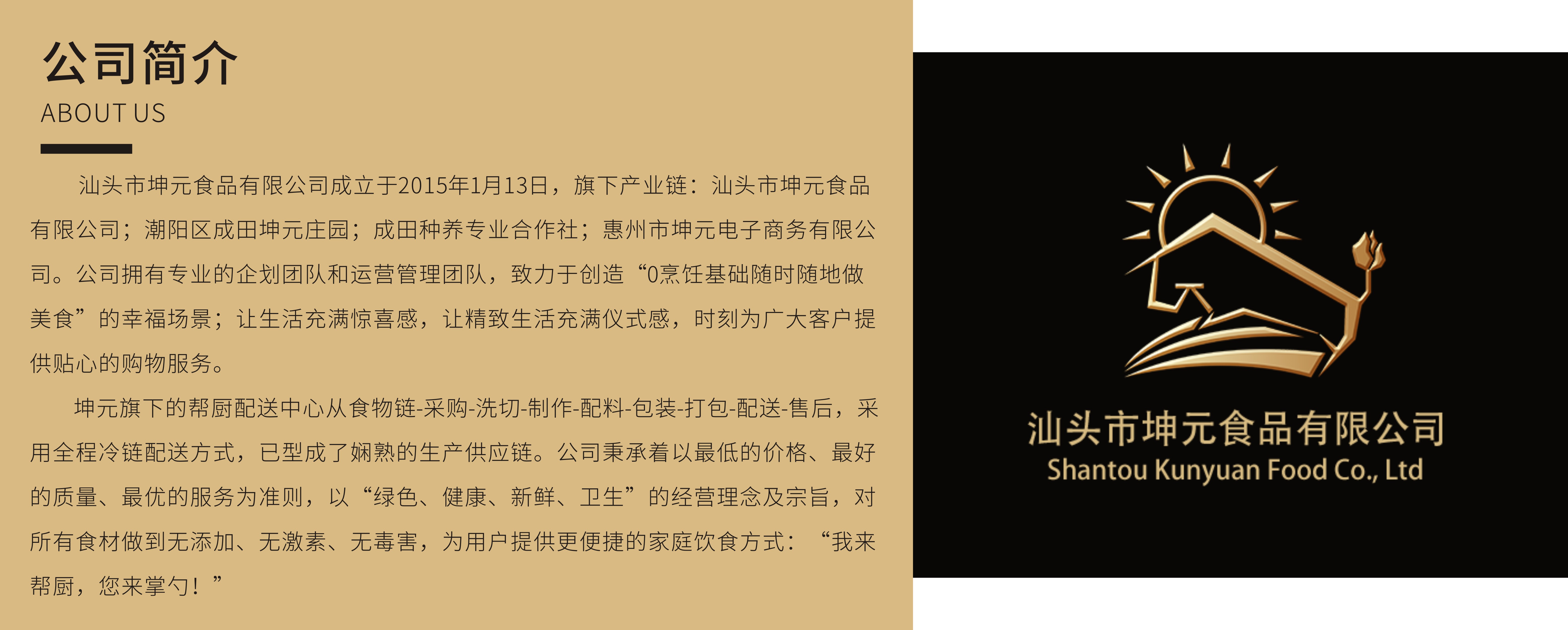 坤元幫廚配送中心致力于創造“0烹飪基礎隨時隨地做美食”的幸福場景;讓生活充滿驚喜感,讓精致生活充滿儀式感,時刻為廣大客戶提供貼心的購物服務。從食物鏈-采購-洗切-制作-配料-包裝-打包-配送-售后,采用全程冷鏈配送方式,已型成了嫻熟的生產供應鏈。公司秉承著以最低的價格、最好的質量、最優的服務為準則,以“綠色、健康、新鮮、衛生”的經營理念及宗旨,對所有食材做到無添加、無激素、無毒害,為用戶提供更便捷的家庭飲食方式:“我來幫廚,您來掌勺!”